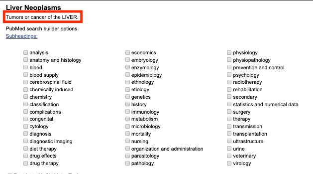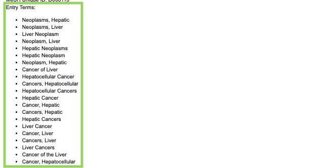 In de database kan je zoeken naar welke MeSH-termen er in gebruik zijn. Zoek je bijvoorbeeld naar ‘liver cancer’ dan verschijnt als eerste de MeSH-term ‘Liver Neoplasms’. Zoeken naar een MeSH term hoeft dus niet letterlijk te gebeuren, over het algemeen worden bekende synoniemen ook herkend. Door een MeSH term te openen krijg je nog veel meer informatie over deze specifieke MeSH-term.