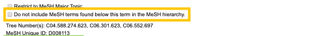 Termen die lager in de boom staan worden automatisch meegenomen wanneer je op de overkoepelende term zoekt. Dus, zoek je de MeSH term ‘Liver Neoplasms’ dan wordt er automatisch ook op de drie termen daaronder gezocht. Mocht je dit niet willen, kan je altijd de optie ‘Do not include MeSH terms found below this term in the MeSH hierarchy’ aanvinken (gele vlak). Er komt dan in de veldcode [Mesh:NoExp] te staan.