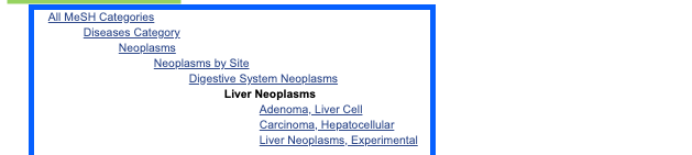 Alle MeSH-termen zijn opgebouwd in een boomstructuur. Wil je breder zoeken kan je er dus voor kiezen om een term hoger in de boom te kiezen, bijv. ‘Digestive System Neoplasms’. Om toch specifieker te zoeken kan je ook een term lager in de boom zoeken, bijv. als je eigenlijk alleen geïnteresseerd bent in Hepatocellular Carcinoma.