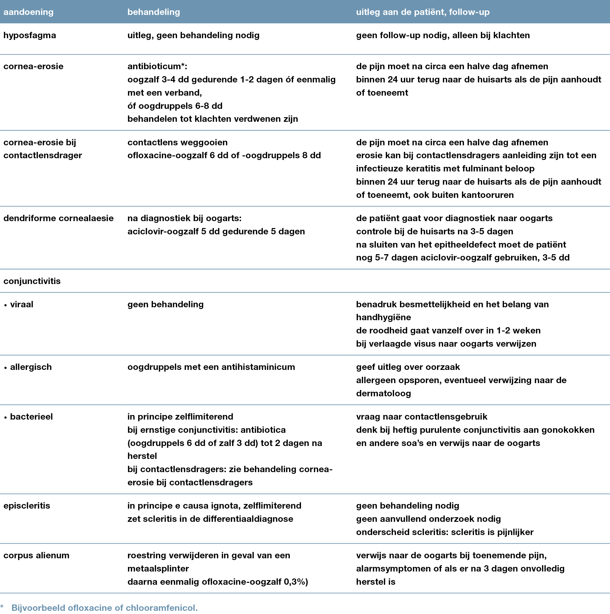 In de oorspronkelijke tekst en in tabel 4 stond abusievelijk dat een cornea-erosie behandeld moet worden met ofloxacine-oogzalf (op geleide van een conceptversie van de richtlijn ‘Infectieuze keratitis’). Dat is niet helemaal juist. Huisartsen en oogartsen behandelen een cornea-erosie vaak met chlooramfenicoloogzalf. Daarom had er moeten staan ‘antibiotische oogzalf’ in plaats van ‘ofloxacine-oogzalf’. De tabel met de juiste behandeladviezen staat hieronder.