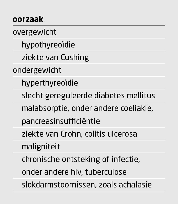 In tabel 3 (Somatische oorzaken van onder- en overvoeding) was de onderverdeling naar oorzaken van ondervoeding en oorzaken van overvoeding niet correct. Ook gaf de tabel geen volledige opsomming van alle oorzaken. Daarom is een herziene versie van tabel 3 gemaakt, die hieronder staat.