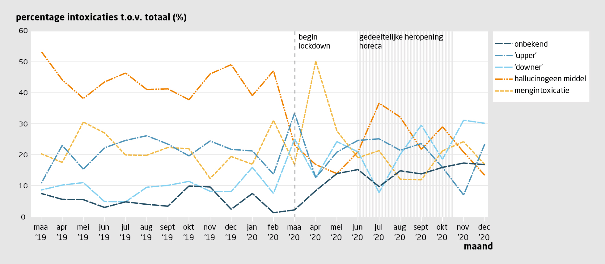 Vanaf maart 2020 nam de incidentie van mengintoxicaties onder Nederlanders af met gemiddeld 7,6 patiënten per maand (n = 284; 17,4% vs. n = 34; 9,8%; p < 0,05). Onder Nederlanders steeg het maandelijkse aantal THC-intoxicaties tijdens de lockdown aanvankelijk (maart 2020: n = 6; 1,4% vs. juni 2020: n = 12; 2,8%; p < 0,05); tijdens de versoepelingen daalde dat aantal weer met 50% (juni 2020: n = 12; 2,8% vs. medio oktober 2020: n = 6; 1,4%; p < 0,05). Vanaf maart 2020 tot aan de versoepelingen steeg in alle groepen – Nederlanders en buitenlandse toeristen – het aantal intoxicaties met een upper steeds verder (maart 2020: n = 54; 12,5% vs. juni 2020: n = 105; 24,5% juni 2020; p < 0,05); tijdens de versoepelingen daalde het aantal geleidelijk (juni 2020: n = 105; 24,5% vs. medio oktober 2020: n = 30; 6,9%; p < 0,05). Het aantal intoxicaties met een onbekende drug steeg geleidelijk gedurende de gehele lockdownperiode (maart 2020: n = 9; 2,1% vs. december 2020: n = 72; 16,7%; p < 0,05).