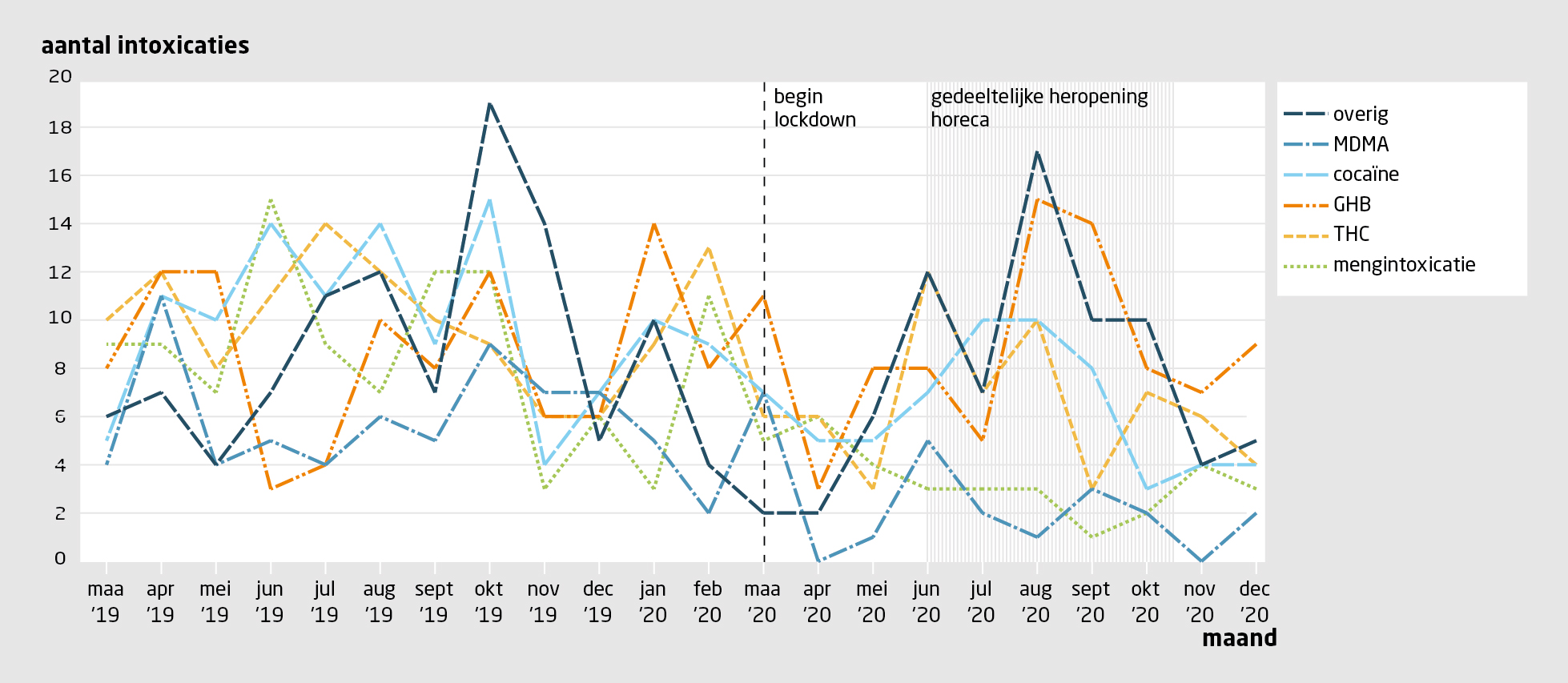 Onder de Amsterdammers is het aantal GHB-intoxicaties relatief toegenomen tijdens de covid-19-periode in 2020 vergeleken met dezelfde periode in 2019; tijdens de versoepelingen in de maanden augustus en september 2020 werd een piek gezien in het aantal GHB-intoxicaties. Het ‘Grote uitgaansonderzoek 2020’ liet echter zien dat het GHB-gebruik fors afnam tijdens de lockdown (3,9% vs. 1,6%).15 Mogelijk hangt GHB-gebruik niet samen met het uitgaansleven, gaat het vaker gepaard met verslavingsproblematiek of brengt het relatief vaak intoxicaties teweeg, bijvoorbeeld doordat het vaak wordt gebruikt door onervaren gebruikers of doordat ervaren gebruikers een versterkte drang voelen om te experimenteren. Het zou interessant zijn om dit verder te onderzoeken.