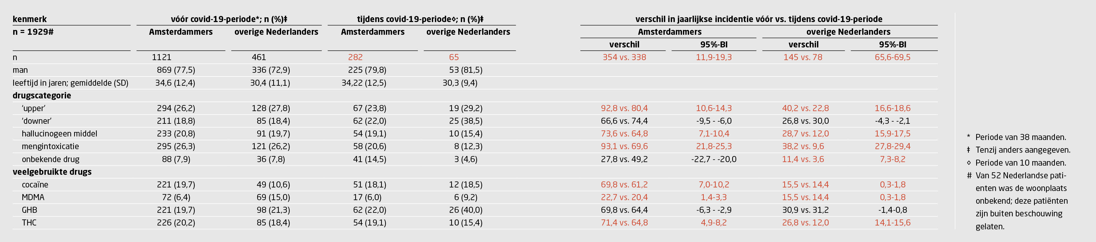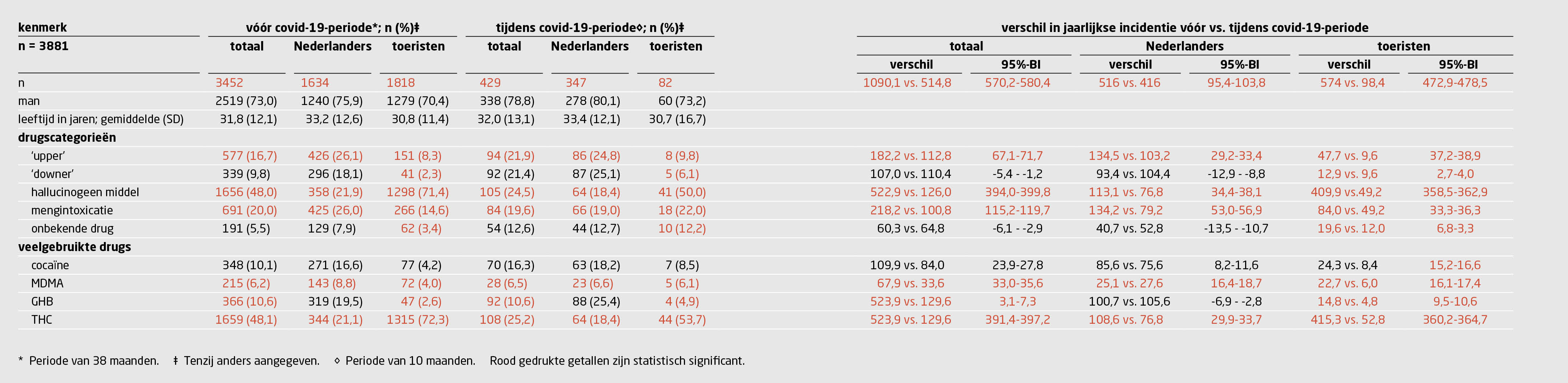 In totaal werden 3881 patiënten geïncludeerd (73,6% man; gemiddelde leeftijd: 32 jaar (SD: 12)); 49,0% van hen was toerist. Tijdens de covid-19-periode daalde het aantal drugsintoxicaties met 53% (1090,1 vs. 514,8 patiënten per jaar); het aantal buitenlandse toeristen met een drugsintoxicatie daalde met 83% (574 vs. 98,4 patiënten per jaar); het aantal Nederlandse patiënten nam af met 20% (516 vs. 416 patiënten per jaar) en het aantal Amsterdammers met 4,5% (354 vs. 338 patiënten per jaar). Onder de Nederlandse patiënten werd een statistisch significante afname gezien van het aantal intoxicaties met cocaïne (85,6 vs. 75,6 patiënten per jaar), MDMA (25,1 vs. 27,6 patiënten per jaar) en THC (108,6 vs. 76,8 patiënten per jaar). Het aantal GHB-intoxicaties bleef vrijwel gelijk (100,7 vs. 105,6 patiënten per jaar).