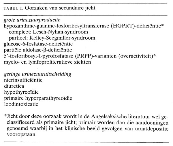Jicht is een verzamelnaam voor aandoeningen die gekenmerkt worden door vorming en neerslag van natriumuraatkristallen. In de Angelsaksische literatuur wordt gesproken van ‘crystal deposition disease’. De oorzaak van jicht is gelegen in afwijkingen van de purine- en urinezuurstofwisseling. De frequentste manifestatie van jicht is jichtartritis (arthritis urica). Behalve gewrichten zijn vooral huid (tophi, cellulitis) en nieren (uraatnefropathie, uraatstenen) aangedaan. In dit artikel wordt vooral ingegaan op jichtartritis. Meestal is er geen onderliggende oorzaak voor de jicht en de verhoogde serumurinezuurconcentratie (hyperurikemie) aantoonbaar. In de Angelsaksische literatuur worden de categorieën ‘primair’, ‘secundair’ en ‘idiopathisch’ onderscheiden; aandoeningen worden geclassificeerd als ‘primaire jicht’ wanneer in het klinisch beeld gevolgen van uraatdepositie vooropstaan. In dit overzicht staat ‘primair’ voor ‘idiopathisch’, terwijl ‘secundair’ aangeeft dat de onderliggendeprovocerende oorzaak bekend is (tabel 1).1